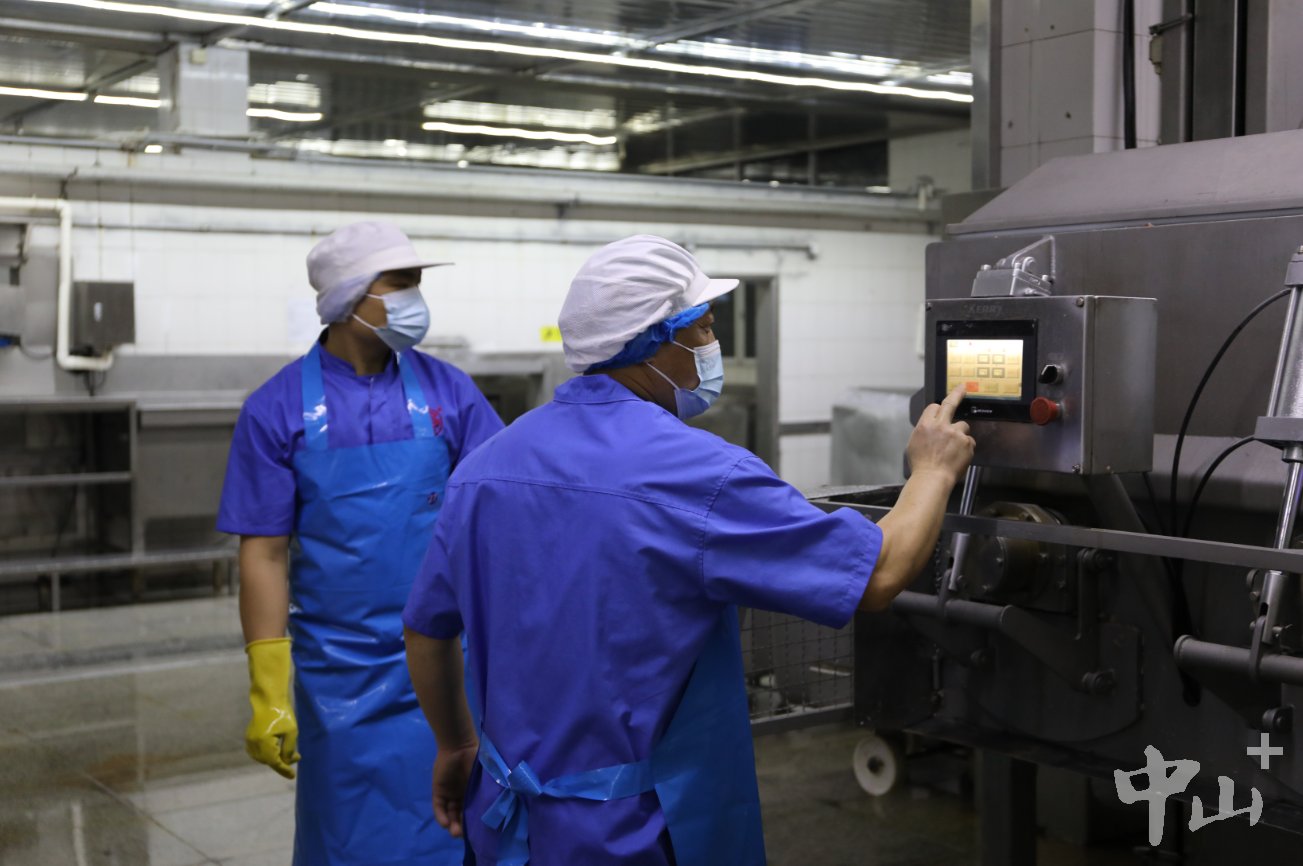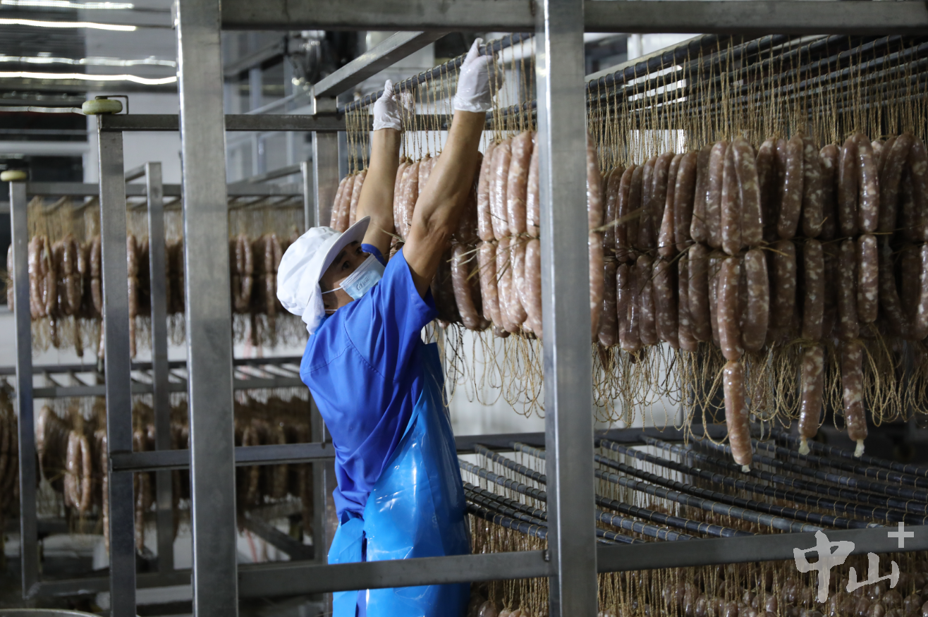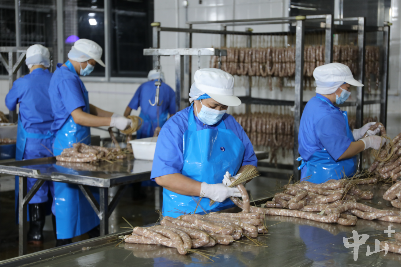 五一節(jié)前,凌晨時(shí)分的黃圃鎮(zhèn)還在“沉睡”,中山市得福肉食制品有限公司(以下簡(jiǎn)稱“得福臘味”)生產(chǎn)車間內(nèi)卻早已燈火通明。一批6000斤廣式臘味正加緊趕制,將于3天后分銷至全國(guó)各地。得益于“廣貨行天下·中山百貨進(jìn)N城”系列活動(dòng)的前期引流,即便是臘味制作傳統(tǒng)淡季,得福臘味車間也沒有停工。4月29日凌晨5時(shí)許,工人們已穿戴好手套、口罩、工作帽與圍裙,在生產(chǎn)線上忙著捆扎、晾曬等收尾工序。