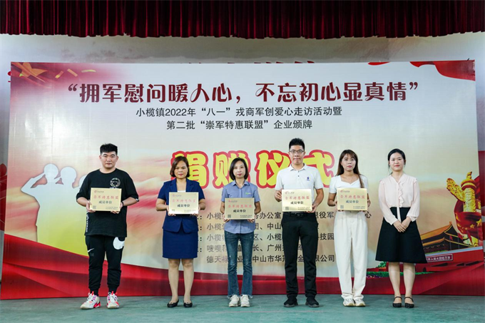 ▲中山市退役軍人服務(wù)中心副主任高亞男(右一)為崇軍特惠聯(lián)盟企業(yè)頒牌。