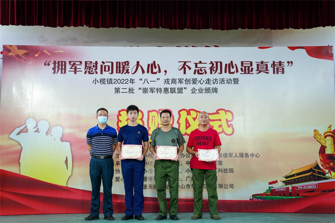 7月24日,小欖鎮(zhèn)舉行“擁軍慰問暖人心,不忘初心顯真情”——2022年“八一”愛心走訪活動(dòng)啟動(dòng)暨第二批“崇軍特惠聯(lián)盟”企業(yè)頒牌儀式。該鎮(zhèn)副鎮(zhèn)長鄧泳標(biāo)、市退役軍人服務(wù)中心副主任高亞男及鎮(zhèn)公共服務(wù)辦、退役軍人服務(wù)中心、高沙社區(qū)、中山好人工作室相關(guān)負(fù)責(zé)人,小欖愛心助學(xué)團(tuán)志愿者、愛心企業(yè)及第二批市“崇軍特惠聯(lián)盟”企業(yè)的代表以及部分優(yōu)秀退役軍人代表近100人參加了活動(dòng)。