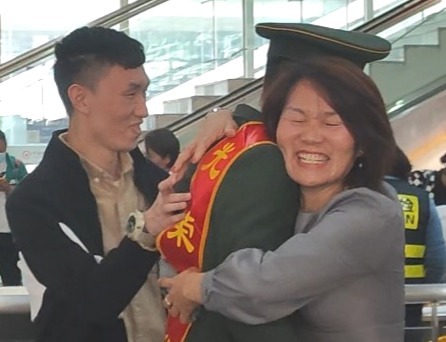 退役士兵黃梓垚在城軌站與母親深情相擁。