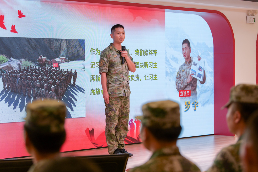 現(xiàn)場(chǎng),新疆高原69316部隊(duì)邊防一營(yíng)副政治教導(dǎo)員、優(yōu)秀共產(chǎn)黨員羅宇,中國(guó)人民解放軍91878部隊(duì)上尉干事郭開強(qiáng),69316部隊(duì)邊防三營(yíng)五連一班班長(zhǎng)張長(zhǎng)城3位部隊(duì)宣講員激情開講,分享感人的軍旅故事。  羅宇分享軍旅故事。記者 易承樂 攝