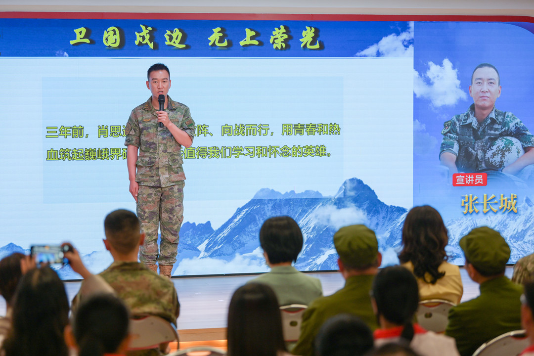 張長(zhǎng)城:肖思遠(yuǎn)的名字永遠(yuǎn)留在連隊(duì) “我是69316部隊(duì)加勒萬(wàn)邊防連‘肖思遠(yuǎn)班’班長(zhǎng)張長(zhǎng)城,很高興今天有機(jī)會(huì)跟大家進(jìn)行交流。三年前,肖思遠(yuǎn)班長(zhǎng)兩闖敵陣、向戰(zhàn)而行,用青春和熱血筑起巍峨界碑,是永遠(yuǎn)值得我們學(xué)習(xí)和懷念的英雄……” 張長(zhǎng)城現(xiàn)場(chǎng)作了主題為《衛(wèi)國(guó)戍邊 無上榮光》的宣講。 張長(zhǎng)城說—— 肖班長(zhǎng)犧牲后,連隊(duì)組建了“肖思遠(yuǎn)班”,班里有一張肖班長(zhǎng)的床,每天晚上,戰(zhàn)士們都會(huì)將肖班長(zhǎng)的被子打開,早上起床再將被子工工整整的疊好;晚上點(diǎn)名,班里的同志輪流向肖班長(zhǎng)匯報(bào)本班和個(gè)人的工作。 連隊(duì)每天的點(diǎn)名,呼點(diǎn)的第一個(gè)名字永遠(yuǎn)是“肖思遠(yuǎn)”,全連齊聲答“到、到、到”,那一刻,感覺下面所有人,望過去都是他! ▌與現(xiàn)場(chǎng)基層干部群眾互動(dòng)交流