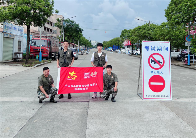 沙溪鎮(zhèn)退役軍人志愿者和民兵協(xié)助公安交警開展高考護(hù)航工作。 7日早上7時(shí)許,在沙溪鎮(zhèn)寶珠東路龍山中學(xué)路口,多名退役軍人紅旗志愿服務(wù)隊(duì)隊(duì)員和民兵協(xié)助公安交警在路口設(shè)立警戒線,做好交通疏導(dǎo)、公共秩序維護(hù)、卡點(diǎn)值守等服務(wù),同時(shí)為考生及家長提供礦泉水、應(yīng)急救援等服務(wù),給考生營造一個(gè)安全、寧靜、有序、文明的考試環(huán)境。 在中山市桂山中學(xué)門口,三鄉(xiāng)鎮(zhèn)退役軍人志愿者和民兵按照事先分工安排,分散在各個(gè)交通路口,有的拉警戒線,有的指揮車輛通行,有的疏散人群,有的負(fù)責(zé)在助力點(diǎn)發(fā)放礦泉水,他們精神抖擻,干勁十足,積極協(xié)助公安民警,做好考場周邊交通秩序維護(hù),確??荚嚻陂g考場周邊環(huán)境安靜有序。
