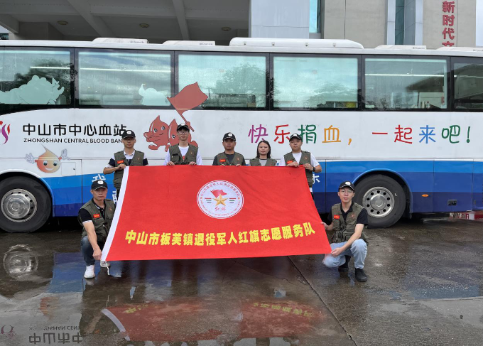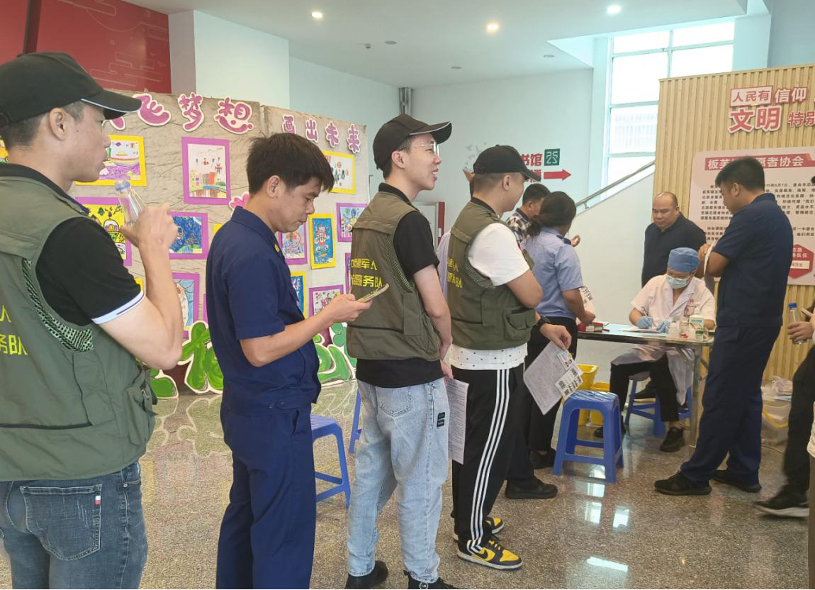 板芙鎮(zhèn)退役軍人紅旗志愿服務(wù)隊隊員排隊等候無償獻血。