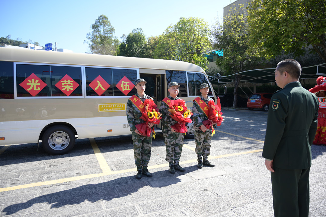 葉陽(yáng)浩、胡家威兩名準(zhǔn)新兵身披“光榮入伍”的紅色綬帶和大紅花昂首挺胸站在太陽(yáng)下,新兵家屬前來(lái)歡送?!瓣?yáng)浩的堂叔叔、外公和叔公都曾應(yīng)征入伍,他能進(jìn)部隊(duì)得到鍛煉,我們作為他的父母感到很光榮、很幸福。”葉陽(yáng)浩的父母胸戴“光榮家屬”的大紅花,露出激動(dòng)的笑容。