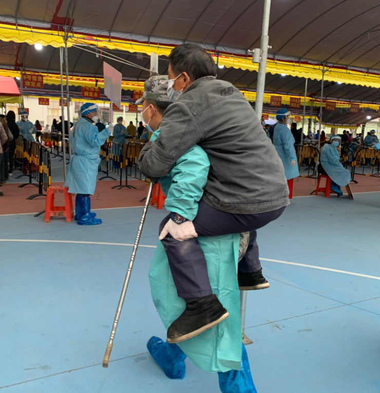 在小欖鎮(zhèn)聯(lián)豐社區(qū)核酸檢測采樣現(xiàn)場,退役軍人吳鴻文背起一位行動不便的老人前往核酸采樣工作臺,采樣結(jié)束后,將老人送出場外。臨走的時候老人連聲向他道謝。 此外,民眾街道退役軍人服務(wù)中心動員紅旗志愿服務(wù)隊退役軍人志愿者分別前往該街道18個免費(fèi)便民核酸采樣點(diǎn),助力街道開展核酸檢測工作。 |