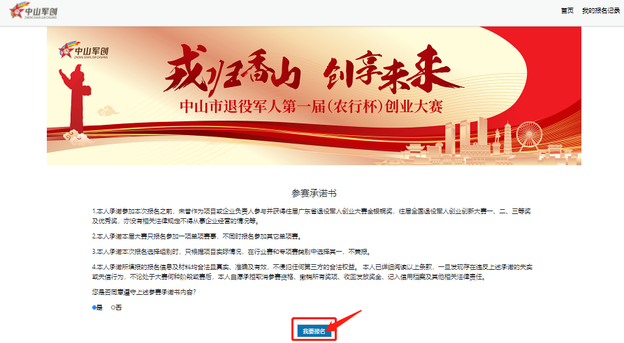圖6 04 同意參賽承諾書 點(diǎn)擊首頁,跳轉(zhuǎn)至“參賽承諾書”界面。仔細(xì)閱讀參賽承諾書,確認(rèn)同意后點(diǎn)擊【我要報(bào)名】按鈕。如圖7-8所示: