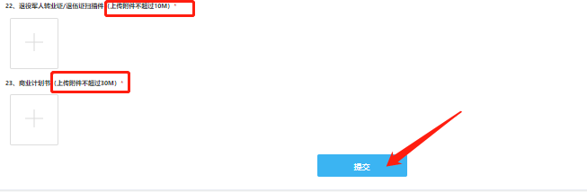 圖10 07 填寫報(bào)名表 學(xué)歷一欄系統(tǒng)默認(rèn)為“初中”,如需修改,點(diǎn)擊可跳出其他內(nèi)容選項(xiàng),按實(shí)際情況選擇即可。注意根據(jù)內(nèi)容提示填寫相應(yīng)正確信息,有“*”標(biāo)志的為必填內(nèi)容,注意退役軍人轉(zhuǎn)業(yè)證/退伍證掃描件上傳附件不得超過10M,商業(yè)計(jì)劃書上傳附件不得超過30M。報(bào)名表所有項(xiàng)目內(nèi)容格式須完全填寫正確才可成功上傳。如圖11-12所示: