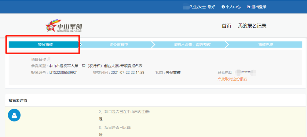 圖12 參賽用戶完成注冊后,點(diǎn)擊【提交】按鈕,即可報(bào)名成功,提交狀態(tài)顯示為“等待審核”。如圖13-14所示: