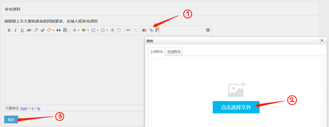 圖14 08 補(bǔ)充資料提交 若想對已提交的報(bào)名信息進(jìn)行補(bǔ)充,可在登陸首頁點(diǎn)擊“我的報(bào)名記錄”,點(diǎn)擊【查看詳情】進(jìn)入報(bào)名表詳情頁面,拉至頁面底部的補(bǔ)充資料欄,點(diǎn)擊回形針圖標(biāo)添加補(bǔ)充文件,再點(diǎn)擊提交即可。如圖15-16所示: