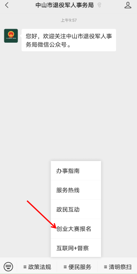 圖16 微信公眾號(hào)報(bào)名 01關(guān)注官方微信公眾號(hào) 微信搜索“中山市退役軍人事務(wù)局”或者掃描下方二維碼,即可關(guān)注公眾號(hào)。進(jìn)入“中山市退役軍人事務(wù)局”官方微信公眾號(hào),在下方功能欄找到“便民服務(wù)”,點(diǎn)擊選擇“創(chuàng)業(yè)大賽報(bào)名”即可進(jìn)入報(bào)名系統(tǒng)。如圖17-19所示: