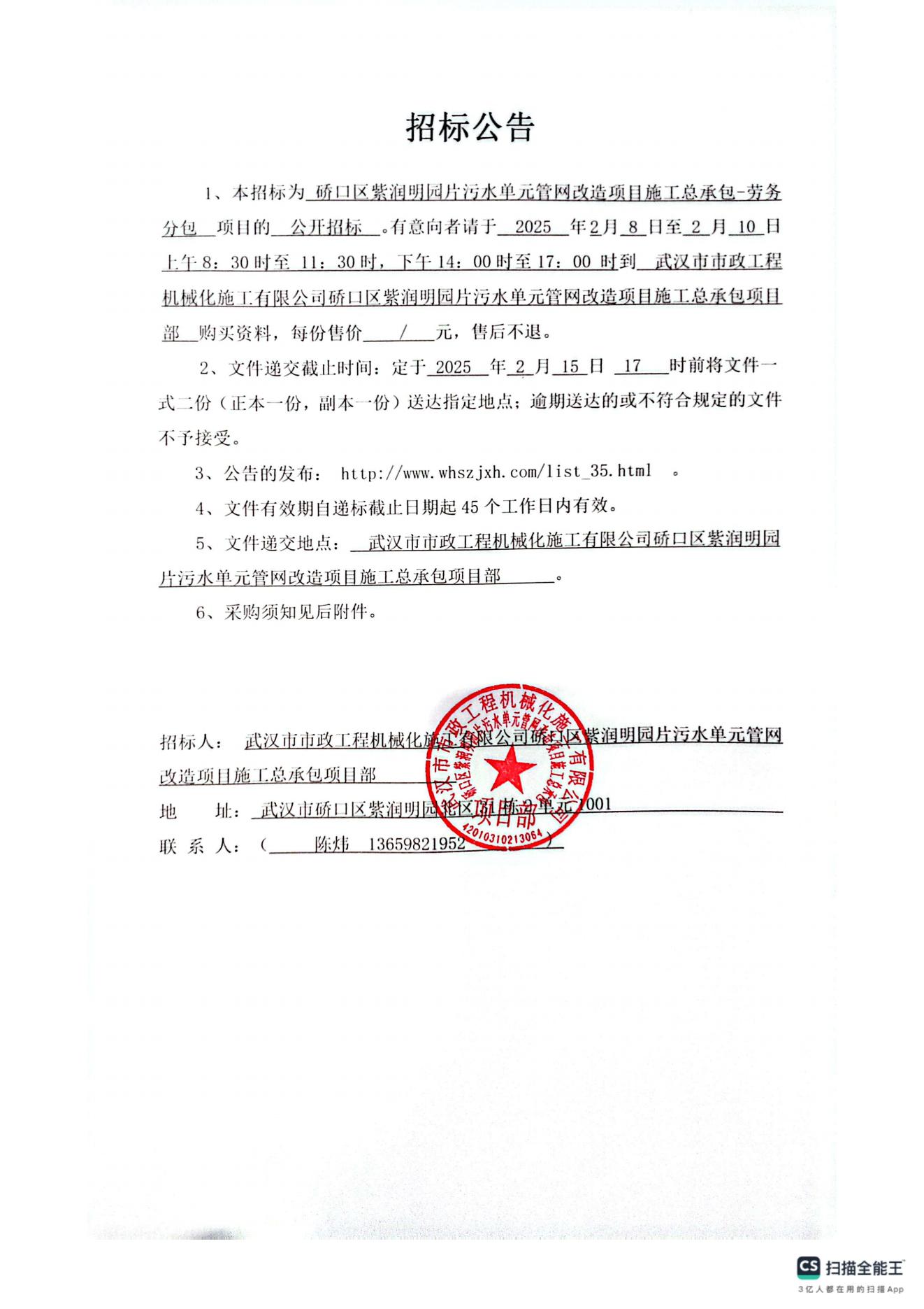 硚口區(qū)紫潤明園片污水單元管網(wǎng)改造項目施工總承包-勞務(wù)分包招標(biāo)公告