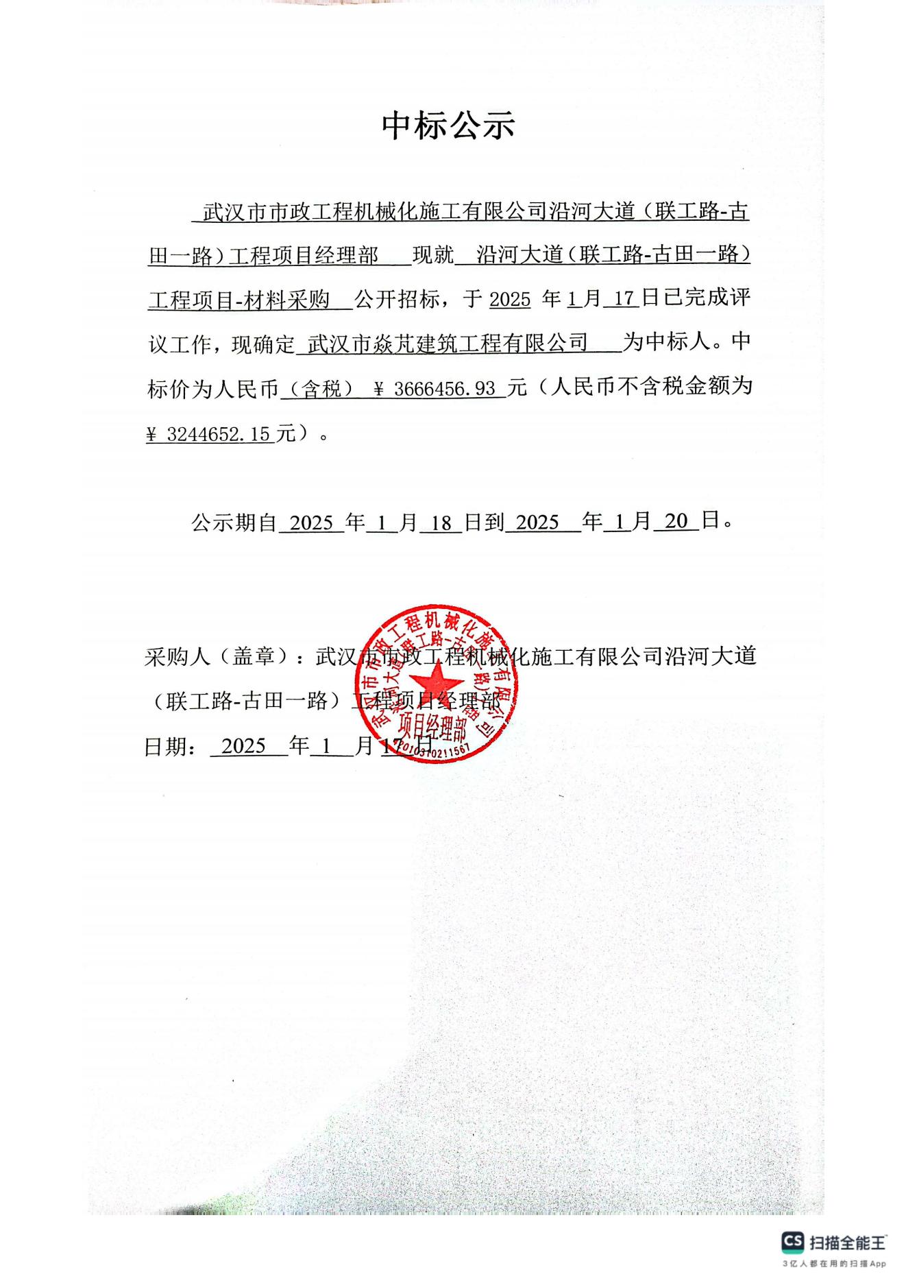 沿河大道(聯(lián)工路-古田一路)工程-材料采購(gòu)中標(biāo)公示