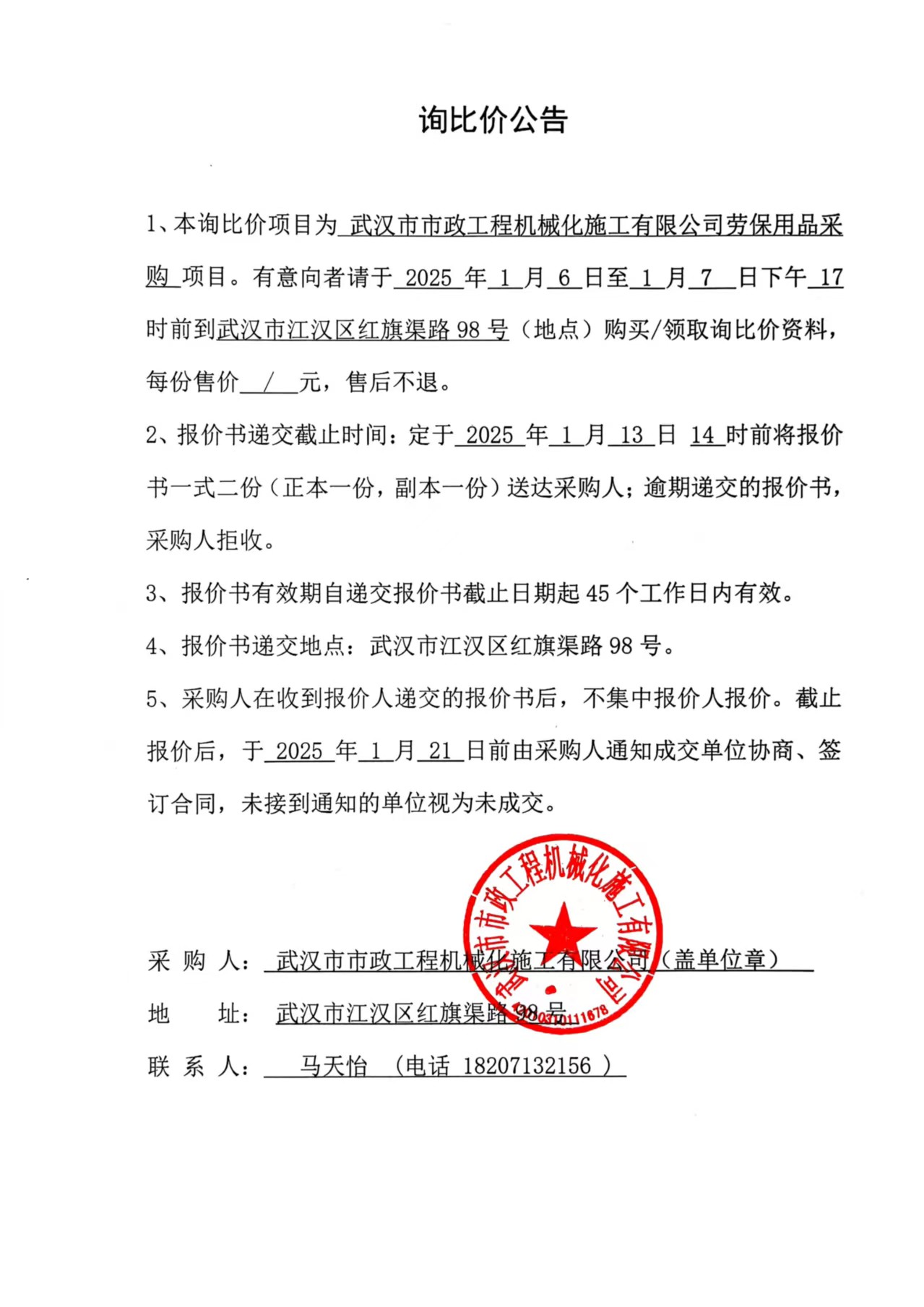 武漢市市政工程機(jī)械化施工有限公司勞保用品采購(gòu)詢價(jià)公告
