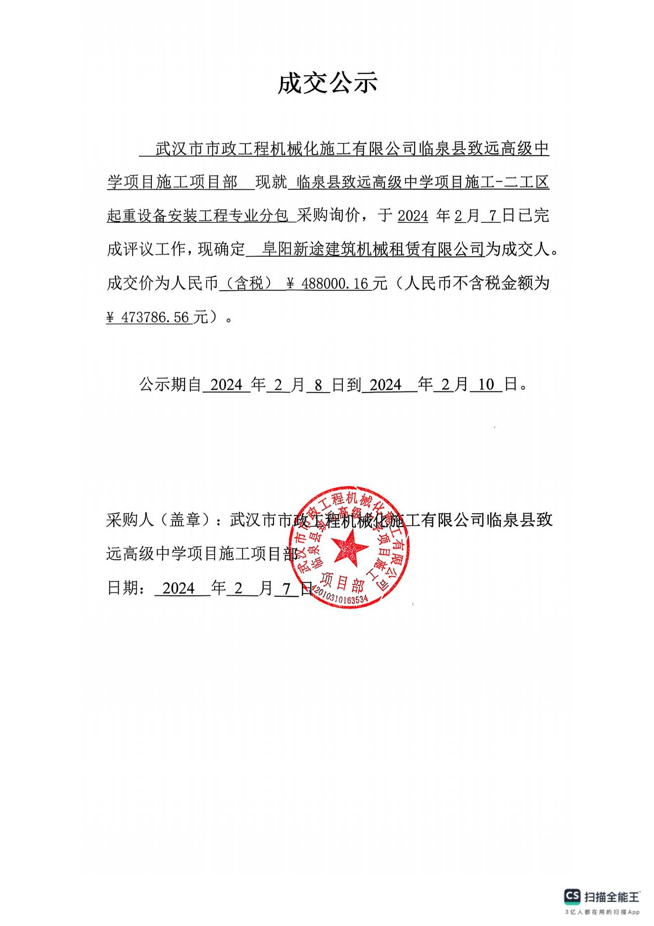 臨泉縣致遠(yuǎn)高級中學(xué)項目施工-二工區(qū)起重設(shè)備安裝工程專業(yè)分包成交公示