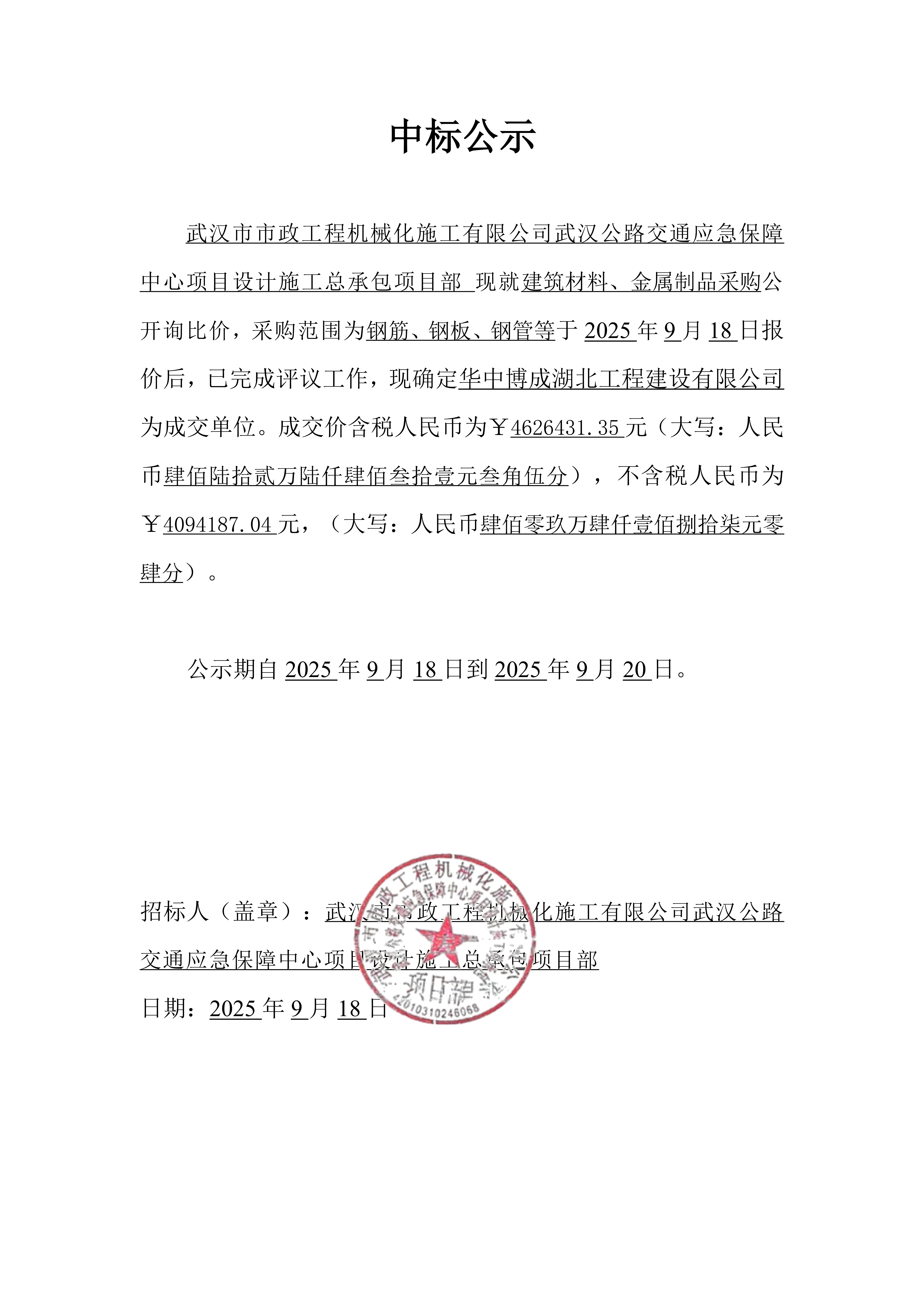 武漢公路交通應(yīng)急保障中心項(xiàng)目設(shè)計(jì)施工總承包建筑材料、金屬制品采購中標(biāo)公示