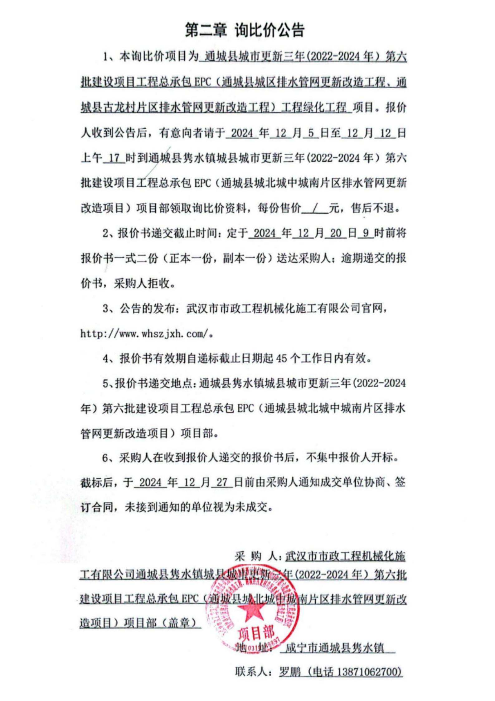 通城縣城市更新三年(2022-2024年)第六批建設(shè)項(xiàng)目工程總承包EPC(通城縣城區(qū)排水管網(wǎng)更新改造工程、通城縣古龍村片區(qū)排水管網(wǎng)更新改造工程)工程綠化工程詢價(jià)公告