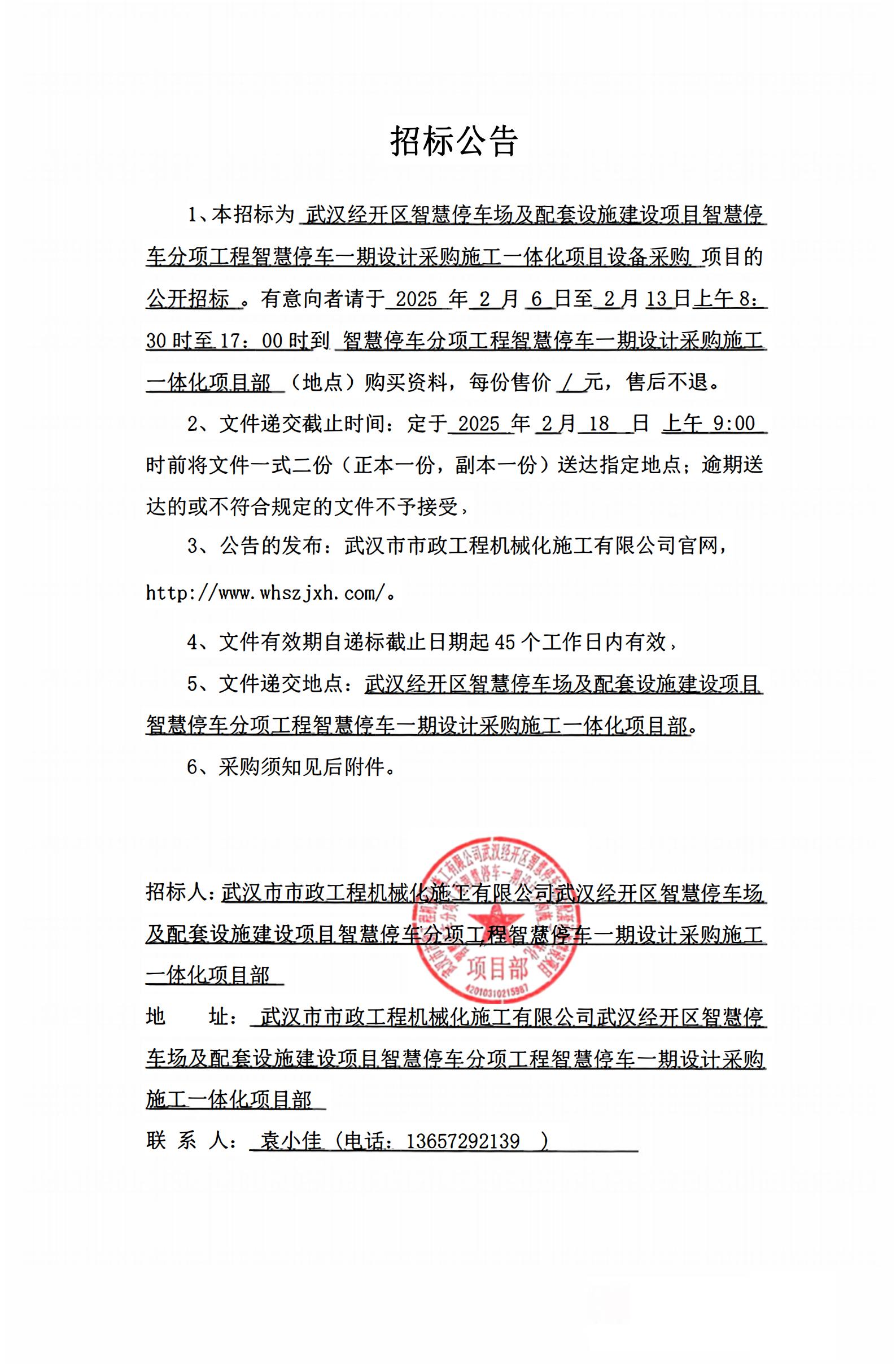 武漢經開區(qū)智慧停車場及配套設施建設項目智慧停車分項工程智慧停車一期設計采購施工一體化項目 設備采購招標公告