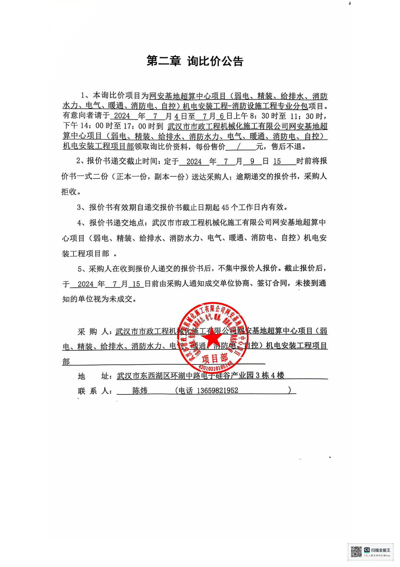網(wǎng)安基地超算中心項目(弱電、精裝、給排水、消防水力、電氣、暖通、消防電、自控)機電安裝工程-消防設(shè)施工程專業(yè)分包詢價公告