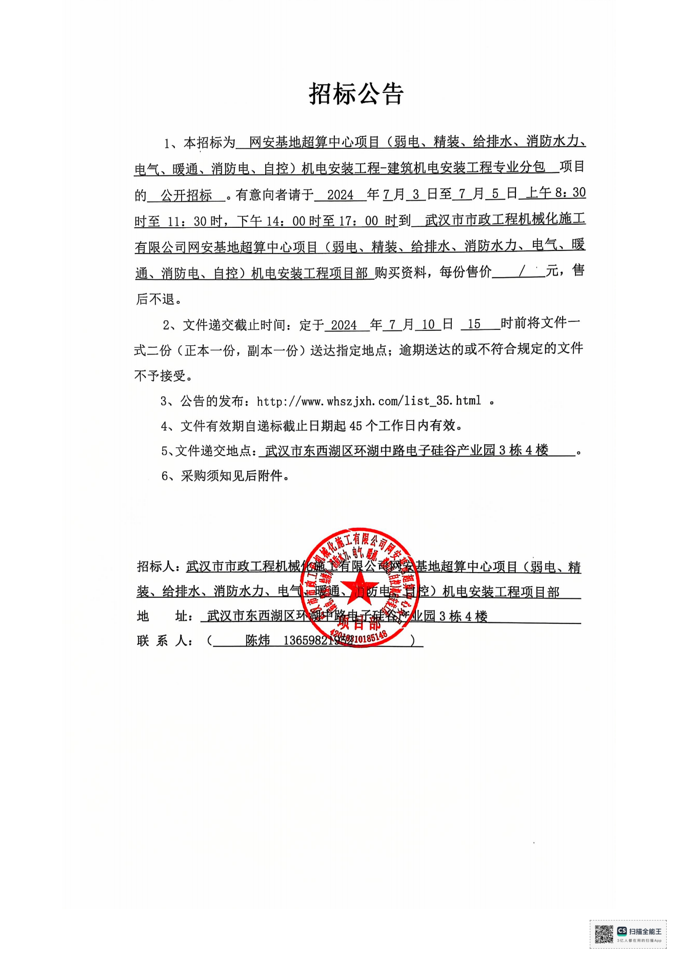 網(wǎng)安基地超算中心項(xiàng)目(弱電、精裝、給排水、消防水力、電氣、暖通、消防電、自控)機(jī)電安裝工程-建筑機(jī)電安裝工程專業(yè)分包招標(biāo)公告