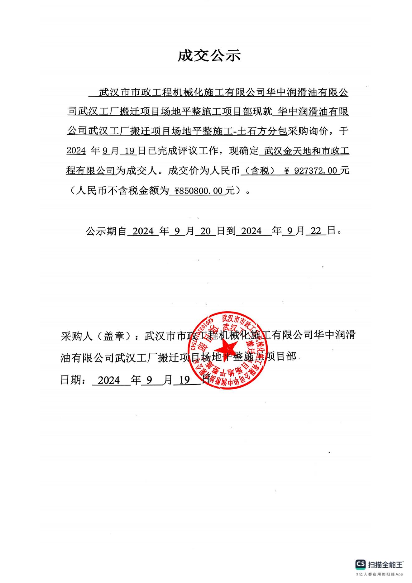 華中潤滑油有限公司武漢工廠搬遷項(xiàng)且場(chǎng)地平整施工土石方分包成交公示