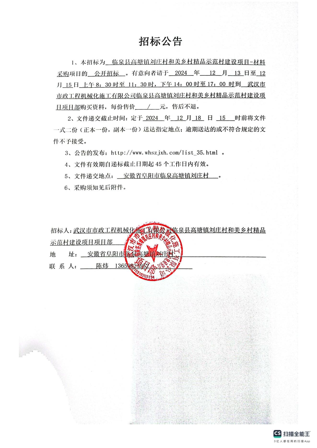 臨泉縣高塘鎮(zhèn)劉莊村和美鄉(xiāng)村精品示范村建設(shè)項目-材料采購招標(biāo)公告