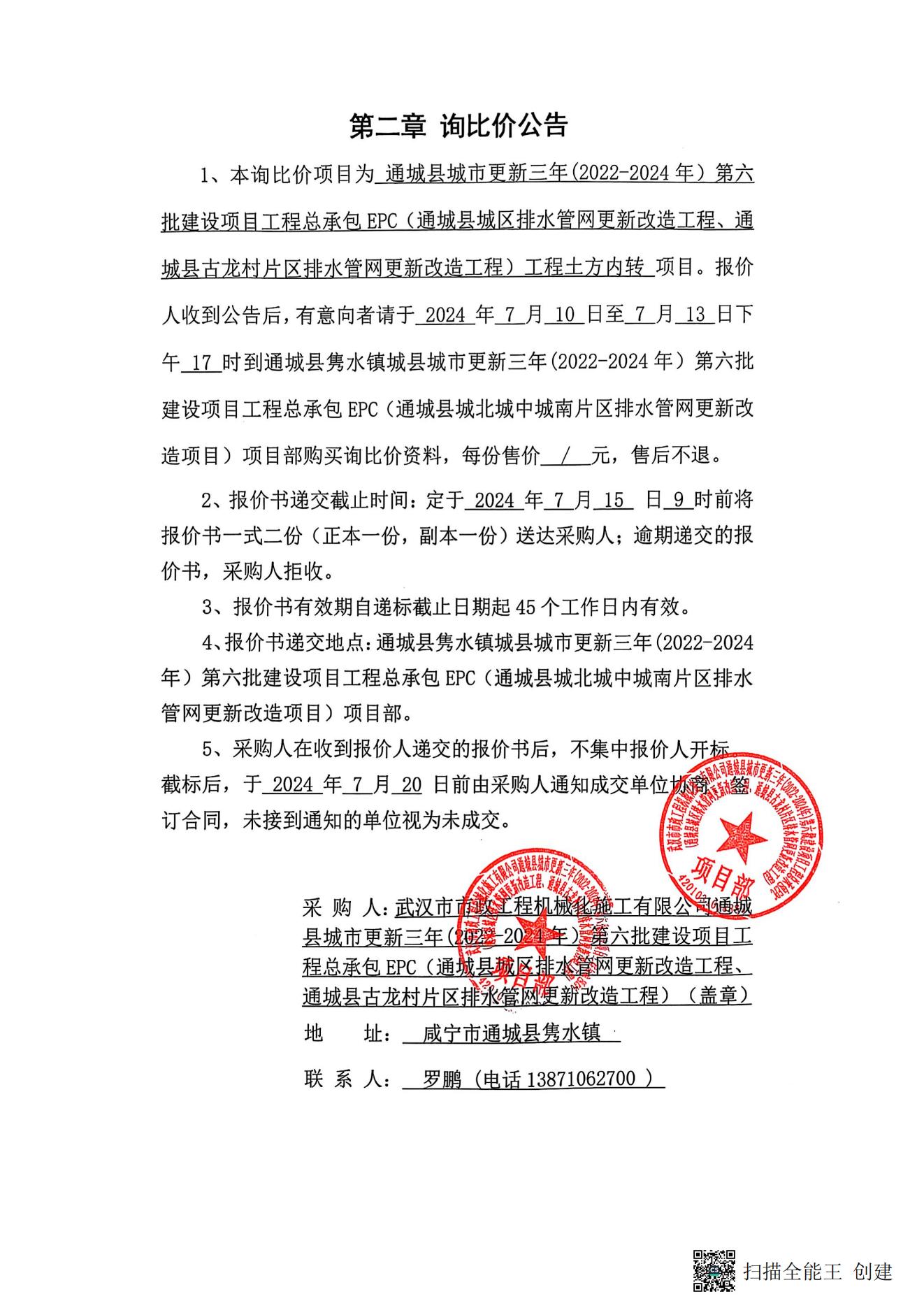 通城縣城市更新三年(2022-2024年)第六批建設(shè)項目工程總承包EPC(通城縣城北城中城南片區(qū)排水管網(wǎng)更新改造項目)土方內(nèi)轉(zhuǎn)工程詢價公告