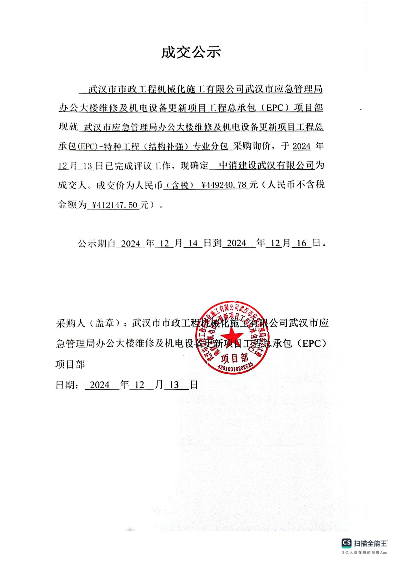 武漢市應(yīng)急管理局辦公大維修及機(jī)電設(shè)樓備更新項(xiàng)目工程總承包(EPC) -特種工程(結(jié)構(gòu)補(bǔ)強(qiáng))專業(yè)分包成交公示