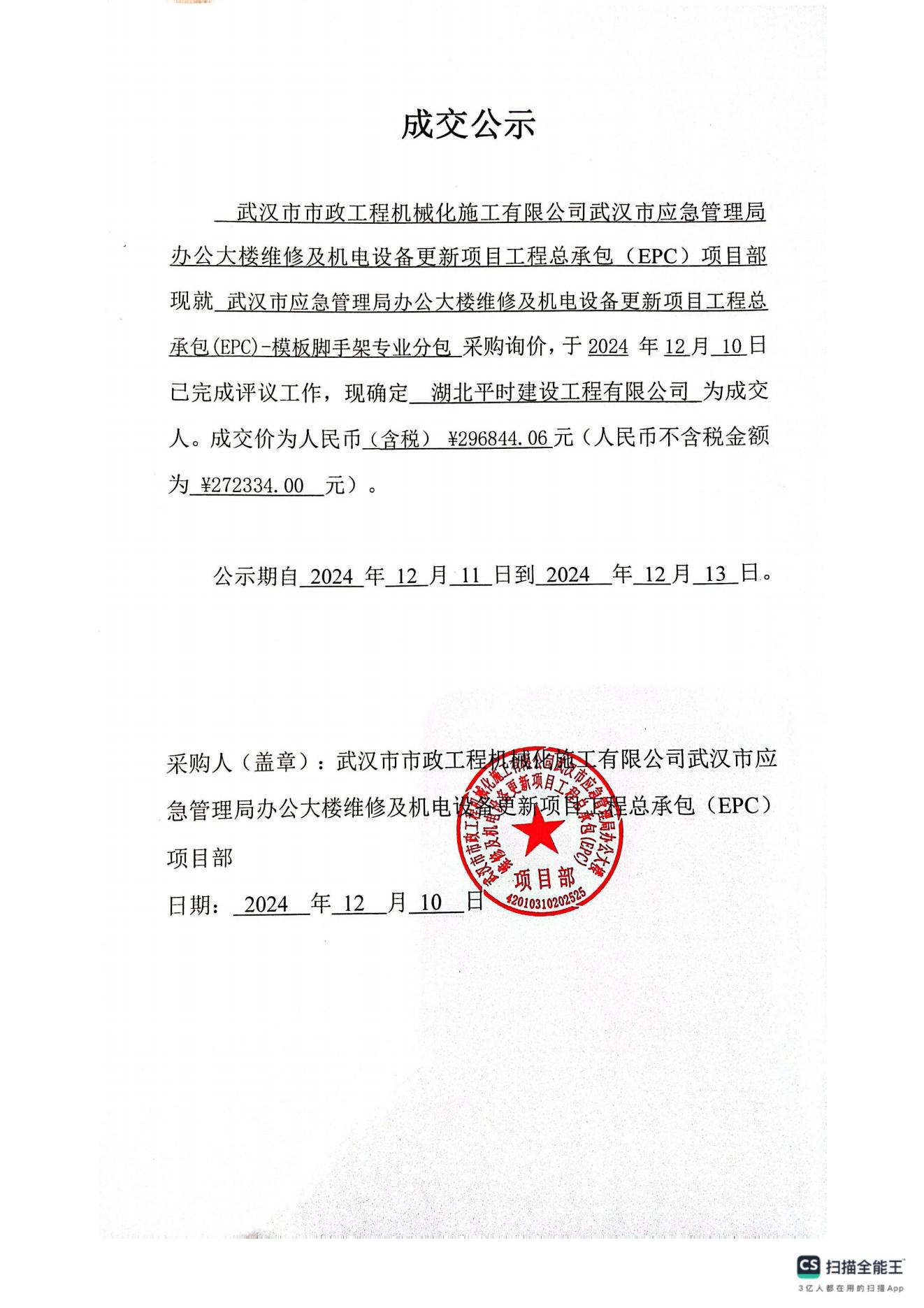 武漢市應(yīng)急管理局辦公大樓維修及機(jī)電設(shè)備更新項(xiàng)目工程總承包(EPC) -模板腳手架專業(yè)分包成交公示