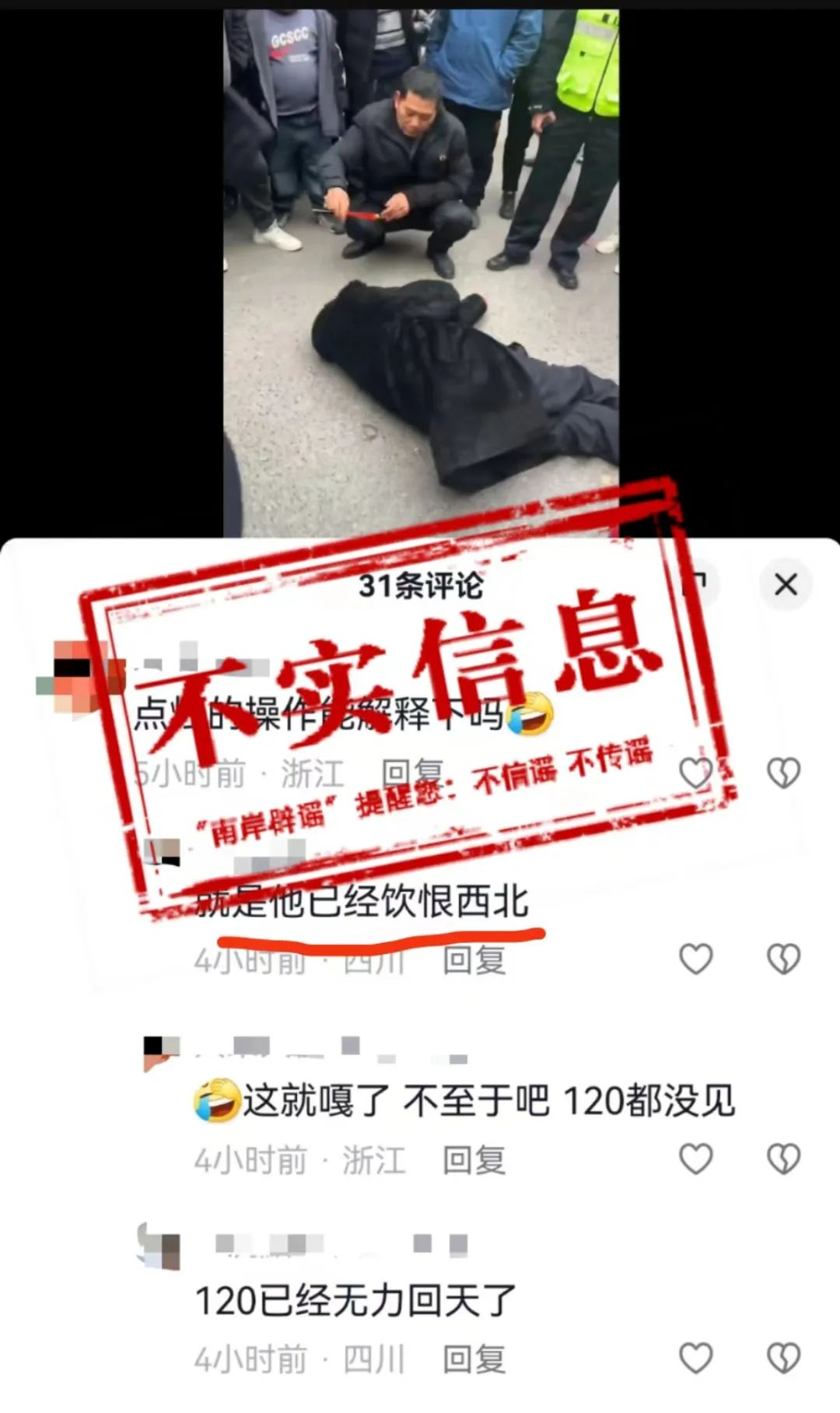 經(jīng)核實(shí),該信息為不實(shí)信息。1月29日下午15:30左右,一男子因醉酒在廣陽鎮(zhèn)明月沱街道上倒地昏睡,約20分鐘酒醒后自行離開,并非網(wǎng)友猜測(cè)的醉酒死亡。