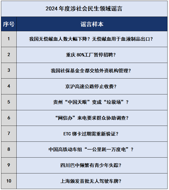 2024年2月,個(gè)別自媒體發(fā)出“無(wú)償獻(xiàn)血人數(shù)大幅下降,無(wú)償獻(xiàn)血用于血液制品出口”的不實(shí)言論,利用全社會(huì)對(duì)公益事業(yè)的關(guān)注和信息不對(duì)稱誤導(dǎo)公眾,故意抹黑我無(wú)償獻(xiàn)血政策,影響血液采集正常秩序,引發(fā)公眾對(duì)無(wú)償獻(xiàn)血的誤解。一些別有用心之人惡意編造謠言“我國(guó)社保基金全都交給外資機(jī)構(gòu)管理”,抓住社?;鸸芾碇械牟糠终:献鬟M(jìn)行夸大和錯(cuò)誤解讀,以偏概全、歪曲事實(shí),引發(fā)公眾對(duì)社保體系的擔(dān)憂和恐慌。還有一些自媒體夸大其詞、虛構(gòu)數(shù)據(jù),捏造謠言“重慶80%工廠暫停招聘”,干擾勞動(dòng)力市場(chǎng)正常秩序,影響地區(qū)經(jīng)濟(jì)發(fā)展。所謂“‘網(wǎng)信辦’來(lái)電要求群眾協(xié)助調(diào)查”則實(shí)為詐騙分子冒充權(quán)威機(jī)構(gòu)行騙,嚴(yán)重?fù)p害政府部門的公信力。