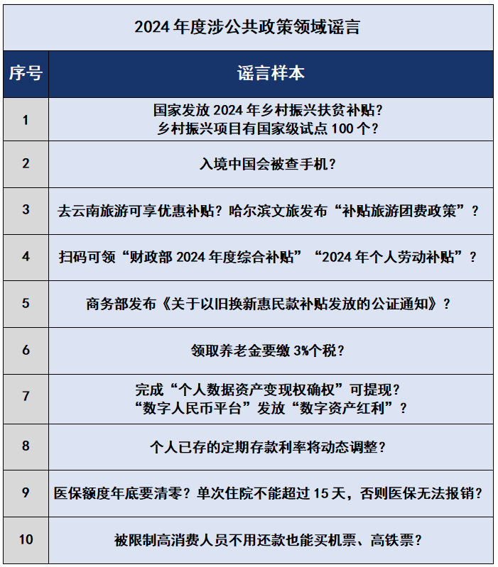 2024年3月,有不法分子冒用國(guó)家機(jī)關(guān)名義,假稱“國(guó)家發(fā)放2024年鄉(xiāng)村振興扶貧補(bǔ)貼”“鄉(xiāng)村振興項(xiàng)目有國(guó)家級(jí)試點(diǎn)100個(gè)”,以高額返利為誘餌,引誘大量不明真相的群眾加入所謂的各類“基金會(huì)”和“項(xiàng)目”,巧立名目騙取錢財(cái)。還有自媒體從公開發(fā)布的政策信息中摘取碎片化信息,斷章取義,對(duì)政策歪曲解讀。如2024年10月,個(gè)別自媒體故意混淆“個(gè)人養(yǎng)老金”與“基本養(yǎng)老金”的概念,傳播“領(lǐng)取養(yǎng)老金要繳3%個(gè)稅”“養(yǎng)老金個(gè)稅起征點(diǎn)為5000元”等不實(shí)信息,引發(fā)公眾誤解。此外,在《國(guó)家安全機(jī)關(guān)行政執(zhí)法程序規(guī)定》和《國(guó)家安全機(jī)關(guān)辦理刑事案件程序規(guī)定》公布之際,一些別有用心之人借機(jī)造謠抹黑、搬弄是非,大肆炮制所謂“入境中國(guó)都會(huì)被查手機(jī)”的謠言,荒謬至極。