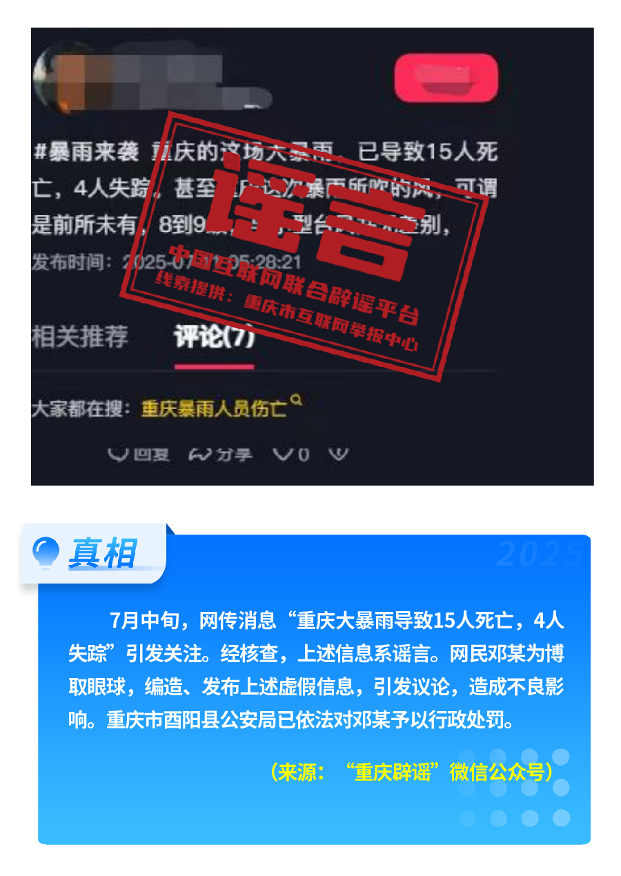近期,網(wǎng)上接連出現(xiàn)發(fā)布虛假“警情通報”的惡性造謠傳謠案件,炮制傳播“昆明駕車撞人案131人死亡”“杭州自來水接入糞水”及涉釋永信虛假“警情通報”,模仿“藍(lán)底白字”格式,杜撰聳人聽聞細(xì)節(jié),損害政府公信力,嚴(yán)重擾亂社會秩序?!霸菏款A(yù)測廣東將發(fā)生8級以上大地震”公然偽造專家聊天截圖,謊報地震預(yù)警。還有造謠者借盛夏高溫酷暑與洪澇災(zāi)害,編造“安徽淮北、山東泰安等地多人因高溫死亡” “重慶大暴雨導(dǎo)致15人死亡、4人失蹤”等謠言,蹭炒熱點、煽動情緒。