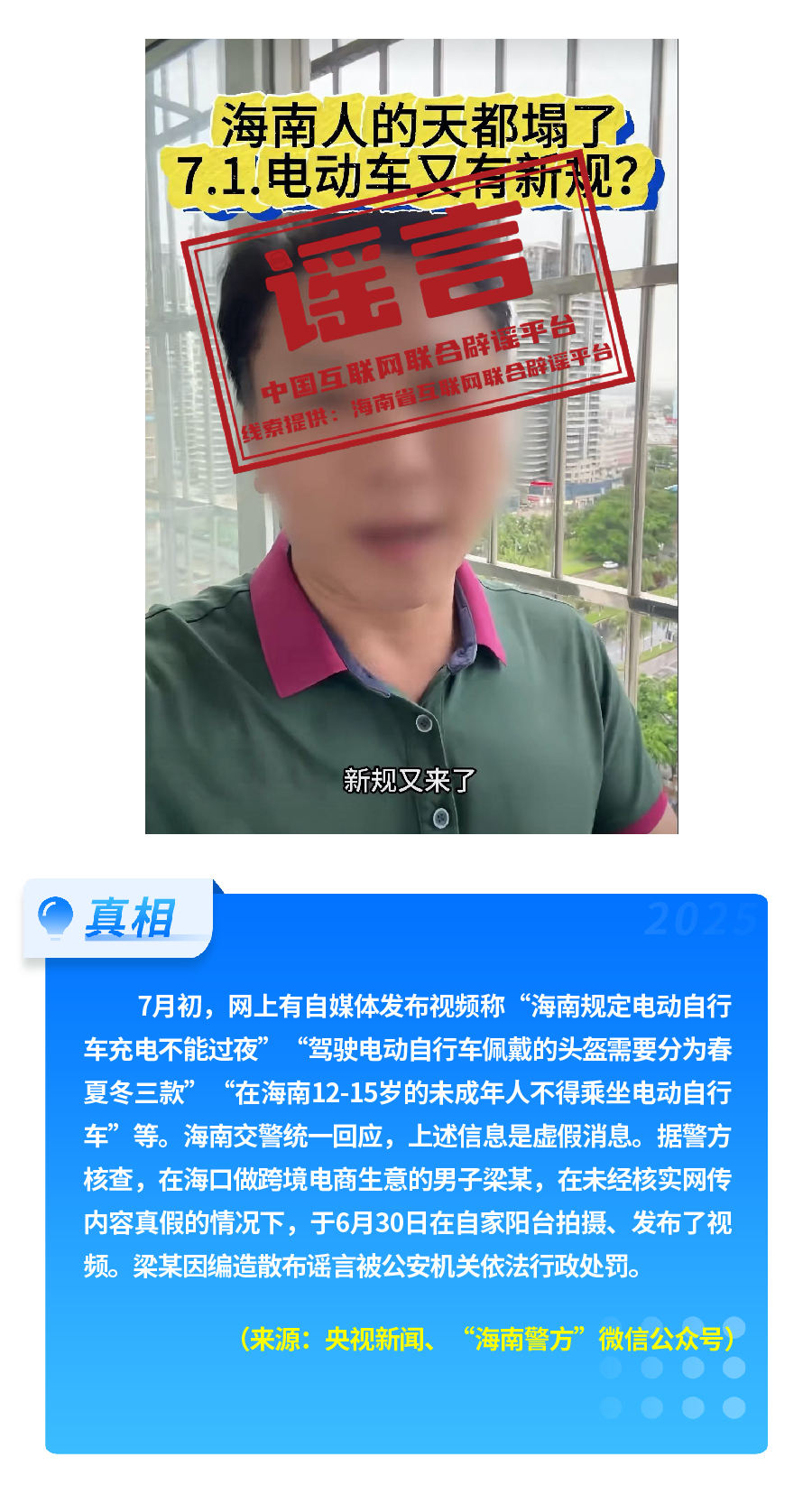 有人重新翻炒“醫(yī)保‘個人賬戶’將全部取消”舊謠,故意歪曲醫(yī)保改革真實內(nèi)涵,嚴(yán)重誤導(dǎo)公眾對醫(yī)保改革政策的理解?!坝袑H松祥T服務(wù)激活醫(yī)保碼”,披著“公共服務(wù)”的外衣,實有詐騙之嫌和安全風(fēng)險。憑空捏造“海南規(guī)定電動自行車充電不能過夜、頭盔分三季”這一“奇葩規(guī)定”,以“新規(guī)”話術(shù),擾亂交通管理秩序。