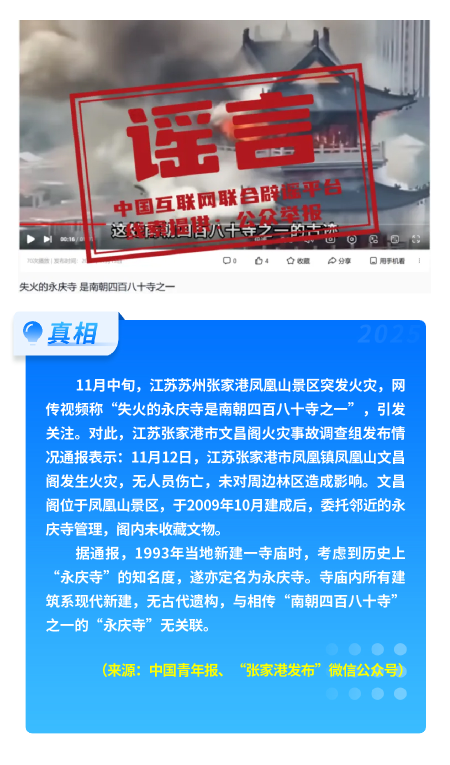 社會熱點事件被歪曲蹭炒。首屆“蘇超”聯(lián)賽泰州隊奪冠后,“冠軍獲五十萬獎金、城市地圖放大字號”等謠言流傳,以夸張信息博眼球、引流量;江蘇張家港鳳凰山景區(qū)火災后,“‘南朝四百八十寺之一’被燒”的謠言引發(fā)熱議,通報顯示失火建筑為2009年新建,與歷史上的南朝寺廟無關聯(lián)。