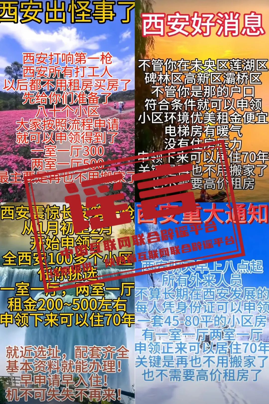 真相:近期,自媒體平臺(tái)上出現(xiàn)以“西安緊急通知”“西安出怪事了”等夸大性、煽動(dòng)性話語(yǔ)為標(biāo)題,散播“憑身份證就可申領(lǐng)”“全西安市100多個(gè)小區(qū)任你挑選”“一次申領(lǐng)可以一直居住”等模糊性、誘導(dǎo)性內(nèi)容的信息。對(duì)此,西安市保障性住房管理中心發(fā)布聲明回應(yīng)稱(chēng),以上內(nèi)容均為不實(shí)信息,是對(duì)西安市公租房政策的歪曲理解和斷章取義。該聲明還特別提醒網(wǎng)民:有關(guān)西安市保障房政策、房源等相關(guān)信息,均以西安市住建局官方媒體發(fā)布的信息為準(zhǔn)。(來(lái)源:陜西省互聯(lián)網(wǎng)聯(lián)合辟謠平臺(tái)、“西安住建”微信公眾號(hào))