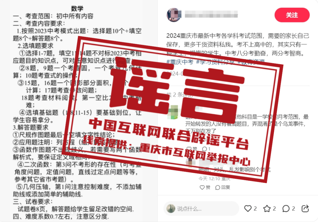 真相:近日,有網(wǎng)民發(fā)布2024年重慶中考各學(xué)科“考查范圍、考查內(nèi)容要求、試卷要求和難度系數(shù)”等信息,引發(fā)關(guān)注。經(jīng)核實(shí),重慶市教育科學(xué)研究院有關(guān)研討會尚未召開,且會前未發(fā)布任何有關(guān)中考各學(xué)科命題信息。重慶市教育科學(xué)研究院表示,網(wǎng)上傳播的各學(xué)科“考查范圍、考查內(nèi)容要求、試卷要求和難度系數(shù)”等內(nèi)容均為虛假信息。(來源:重慶辟謠)