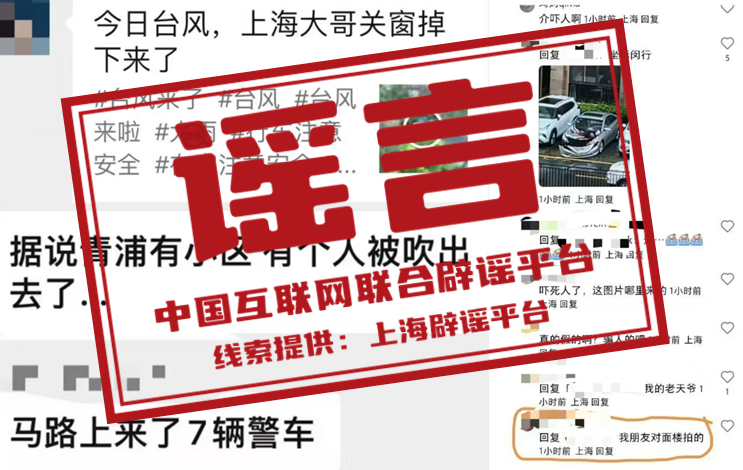 真相:臺風(fēng)“貝碧嘉”影響上海期間,社交平臺和部分聊天群出現(xiàn)上海某小區(qū)居民被臺風(fēng)從高樓吹落的消息,有的說在青浦區(qū)、有的說在閔行區(qū)。經(jīng)核查,該視頻內(nèi)容系外省市有人輕生跳樓。個別違法人員在不知道事發(fā)地點和墜樓原因的情況下,為博取流量而張冠李戴,將事發(fā)地編撰為上海浦東、閔行、青浦等地,并發(fā)布在網(wǎng)上,引起群眾恐慌,造成惡劣社會影響。目前,8名編造傳播謠言的違法人員均已被警方依法處罰。(來源:“上海網(wǎng)絡(luò)辟謠”微信公眾號)