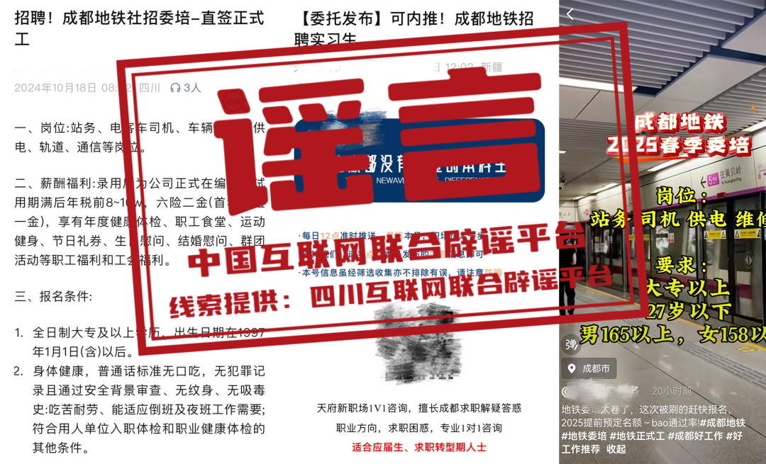 真相:近日,部分網(wǎng)絡(luò)平臺(tái)陸續(xù)出現(xiàn)所謂“成都地鐵內(nèi)推、直簽、提前預(yù)定名額、包通過率”“濟(jì)南地鐵校園招聘有‘真題’、在線筆試一把過”等信息,引發(fā)關(guān)注。對(duì)此,成都軌道集團(tuán)、濟(jì)南軌道交通集團(tuán)均回應(yīng)稱,從未授權(quán)或委托任何中介、個(gè)人或培訓(xùn)機(jī)構(gòu)等第三方組織任何形式的招聘考試輔導(dǎo)或培訓(xùn),也未向任何第三方提供所謂的“真題”或“題庫”,且在招聘過程中不存在收取任何形式的報(bào)名費(fèi)、中介費(fèi)、手續(xù)費(fèi)等或要求應(yīng)聘者繳納任何形式的押金、保證金、活動(dòng)費(fèi)等行為。所有以“直簽”“內(nèi)推”“預(yù)定名額”“保通過率”為噱頭發(fā)布的信息均為虛假信息。請(qǐng)廣大應(yīng)聘者、考生及市民朋友注意甄別,謹(jǐn)防受騙。(來源:四川互聯(lián)網(wǎng)舉報(bào)辟謠平臺(tái)、山東互聯(lián)網(wǎng)聯(lián)合辟謠平臺(tái)、成都網(wǎng)絡(luò)辟謠、濟(jì)南互聯(lián)網(wǎng)聯(lián)合辟謠平臺(tái))