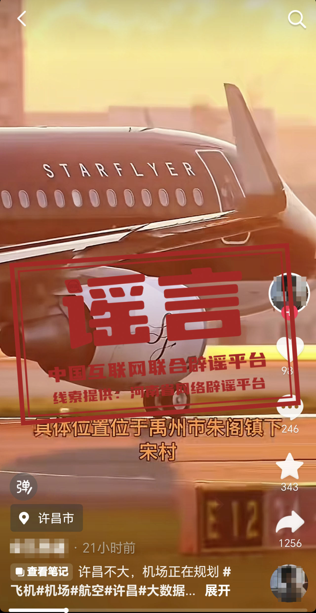 真相:近日,有網(wǎng)民在某平臺發(fā)布視頻稱:“未來河南許昌將建設禹州、襄城、鄢陵3個機場,其中禹州市的通用機場具體位置在朱閣鎮(zhèn)下宋村,項目總投資為10億元,計劃占地1000畝”等。經(jīng)向相關部門查證,三地的通用機場均處于前期謀劃階段,截至目前,暫未對選址地點、占地數(shù)量及投資金額進行具體規(guī)劃,視頻內(nèi)容為不實信息。(來源:“清朗河南”微信公眾號、網(wǎng)信許昌)