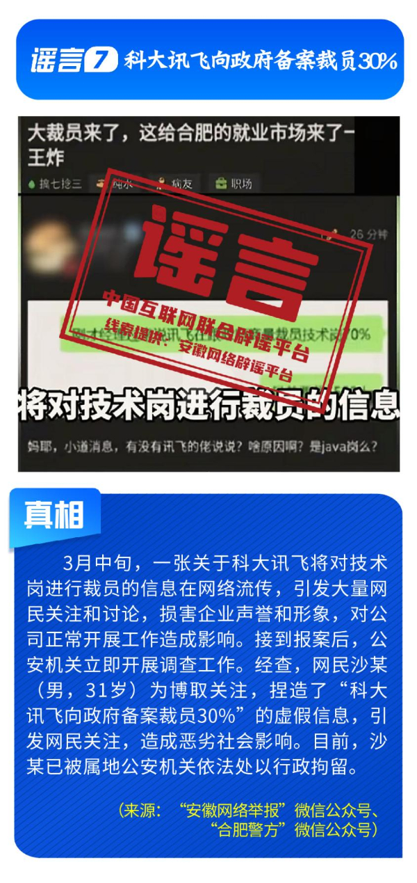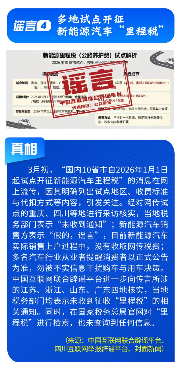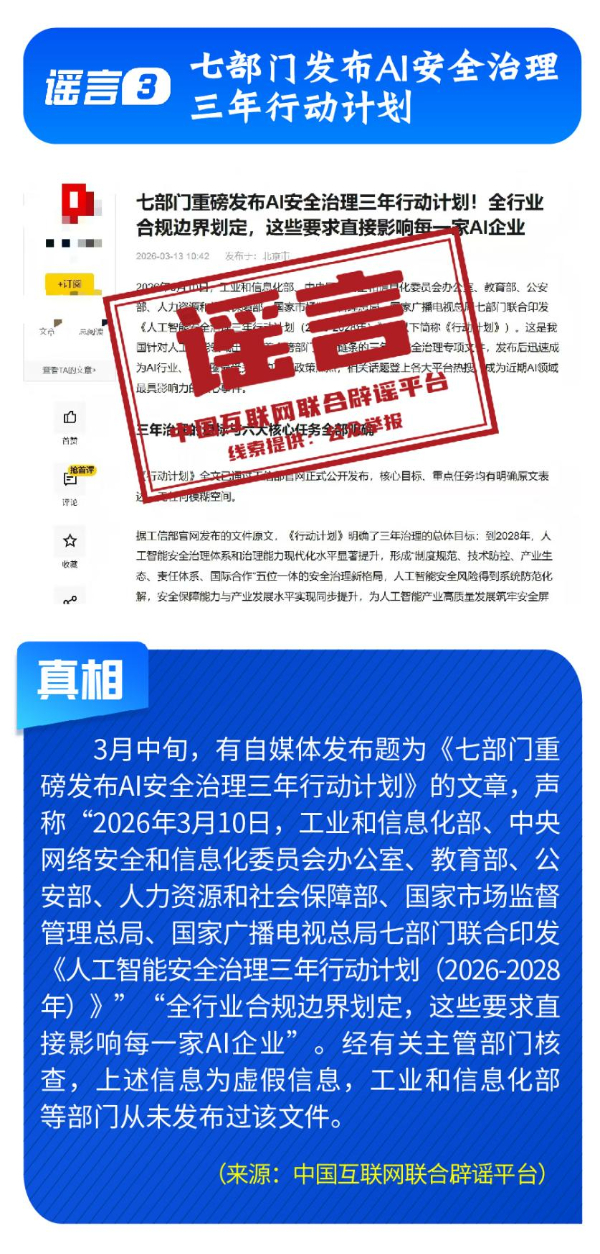 偽造政策文件,擾亂市場預(yù)期。《七部門重磅發(fā)布AI安全治理三年行動(dòng)計(jì)劃》完全是自媒體憑空杜撰,工信部等部門公開表示并無相關(guān)文件;“科大訊飛向政府備案裁員30%”系網(wǎng)民為博關(guān)注而捏造;“農(nóng)業(yè)銀行”發(fā)送高額貸款短信實(shí)為營銷號冒名發(fā)送,并非銀行官方行為;“深圳將禁行電動(dòng)自行車”是對管理措施征求意見稿的誤讀;“多地試點(diǎn)開征新能源汽車‘里程稅’”則列舉虛假試點(diǎn)地區(qū)與收費(fèi)標(biāo)準(zhǔn),已被多地稅務(wù)部門明確予以否認(rèn)。