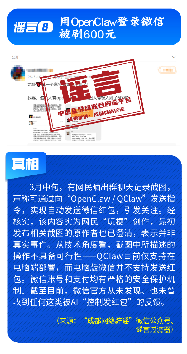 曲解專業(yè)信息,引發(fā)公眾焦慮。“應(yīng)縣木塔即將全部拆卸落地大修”信息,未全面科學(xué)看待應(yīng)縣木塔維修保護(hù)工作,產(chǎn)生誤讀誤解,相關(guān)不實(shí)信息極易引發(fā)不必要的文物保護(hù)擔(dān)憂;“超強(qiáng)厄爾尼諾將致最熱年”的片面斷言,刻意混淆“拉尼娜狀態(tài)”與“拉尼娜事件”等科學(xué)概念,引發(fā)公眾焦慮;“電網(wǎng)公司蓄意調(diào)快電表”的舊謠與“安裝節(jié)電器可立省50%”的新騙局捆綁出現(xiàn),所謂“節(jié)電器”不僅自身耗電,還存在極大安全隱患。而謠言“用OpenClaw登錄微信被刷走600塊”實(shí)為網(wǎng)民借熱點(diǎn)“玩?!背醋鳎l(fā)公眾對網(wǎng)絡(luò)支付安全的恐慌心理。