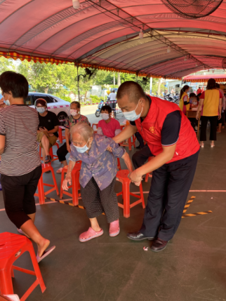 阜沙鎮(zhèn)綜合治理辦主任關國勝協(xié)助長者開展核酸檢測工作。